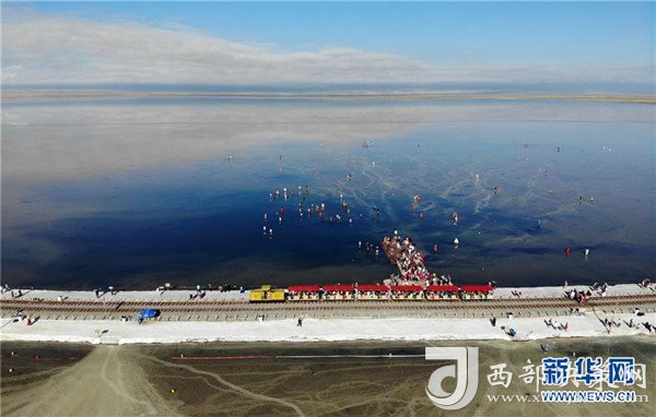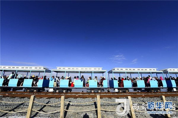 一列景區(qū)觀光火車從茶卡鹽湖景區(qū)內(nèi)經(jīng)過(8月14日攝)。  新華社記者張宏祥攝