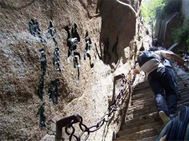 蒼龍嶺是華山著名險道之一,其位于救苦臺南、五云峰下,以其蒼黑色的外部和其似懸龍般的地勢而得名。其如履薄刃,絕壑千尺的地勢使得很多游客膽戰(zhàn)心驚,其中最著名的就是韓愈大哭投書求助的故事并引發(fā)了大量的相關典故和考證,而該處也因此留下了“韓退之投書處”的文化遺產(chǎn)。