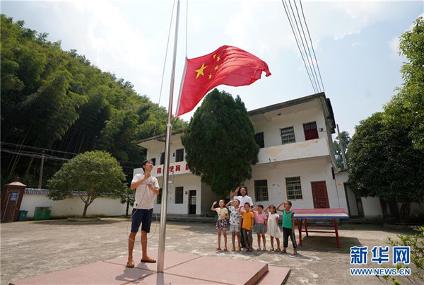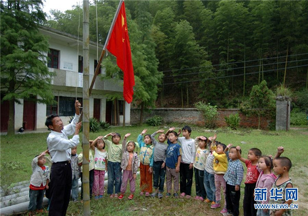 9月4日,在蘆嶺教學(xué)點(diǎn),陳云根(后)和黃文春(前)帶著全校6名學(xué)生升國旗。現(xiàn)在學(xué)校操場(chǎng)已經(jīng)鋪上了水泥。新華社記者 宋振平 攝