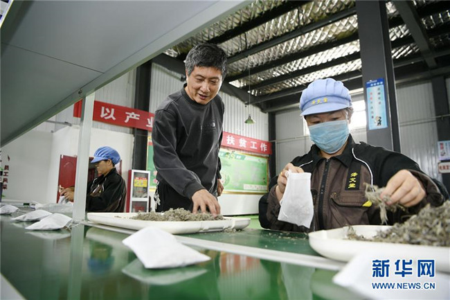 林玉清(中)在寧夏固原市西吉縣寧夏澤艾堂生物科技有限公司向工人講解艾草包裝注意事項(8月30日攝)。來自福建莆田的林玉清2017年3月在西吉縣成立寧夏澤艾堂生物科技有限公司,依托西吉縣優(yōu)質(zhì)的艾草種植條件,采用“公司+合作社+農(nóng)戶”的訂單農(nóng)業(yè)合作模式,與吉強、新營等鄉(xiāng)鎮(zhèn)種植專業(yè)合作社合作建成艾草種植基地11個、推廣種植艾草6000畝,為當(dāng)?shù)厝罕娒撠氈赂讳伨托侣纷印?新華社記者王鵬攝