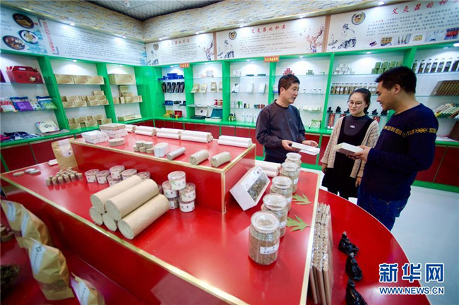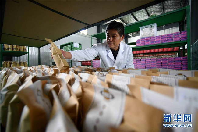 林玉清在寧夏固原市西吉縣寧夏澤艾堂生物科技有限公司查看艾草產(chǎn)品(8月30日攝)。來自福建莆田的林玉清2017年3月在西吉縣成立寧夏澤艾堂生物科技有限公司,依托西吉縣優(yōu)質(zhì)的艾草種植條件,采用“公司+合作社+農(nóng)戶”的訂單農(nóng)業(yè)合作模式,與吉強、新營等鄉(xiāng)鎮(zhèn)種植專業(yè)合作社合作建成艾草種植基地11個、推廣種植艾草6000畝,為當(dāng)?shù)厝罕娒撠氈赂讳伨托侣纷?。新華社記者郭緒雷攝
