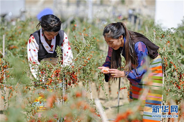 近日,西藏白朗縣萬畝枸杞生態(tài)觀光產(chǎn)業(yè)園進入采摘期。兩年多來,經(jīng)過當?shù)卣推髽I(yè)的共同努力,將原有的沙荒地進行改造,成功栽培7000余畝枸杞目前已果實累累。 新華社記者 張汝鋒 攝