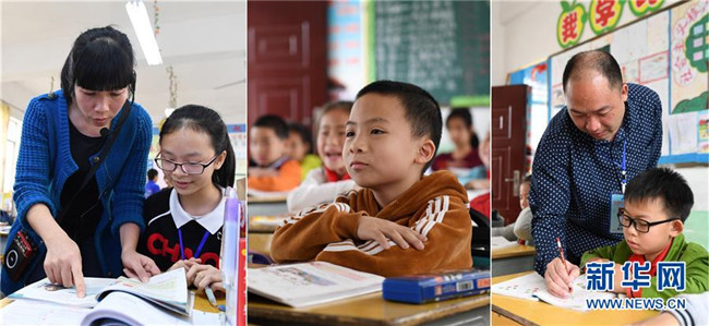 這是一張拼版照片,左圖為:在廣西南寧市馬山縣白山鎮(zhèn)合群初中,溫華芬老師在課后輔導(dǎo)學(xué)生功課(4月10日攝);中圖為:在馬山縣白山鎮(zhèn)同富小學(xué),侯宇宸在聽課(4月10日攝);右圖為:在馬山縣白山鎮(zhèn)同富小學(xué),侯瑞良老師在輔導(dǎo)學(xué)生功課(4月10日攝)。2017年9月,廣東茂名選派優(yōu)秀教師到廣西馬山縣支教。茂名市電白區(qū)木蘇中學(xué)老師溫華芬得知后,與在電白區(qū)陳村中學(xué)任教的丈夫侯瑞良積極響應(yīng),決定帶上9歲的兒子侯宇宸共同來到馬山縣,開展為期一年的支教活動。新華社記者 陸波岸 攝
