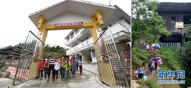這是一張拼版圖片,左圖為2017年11月17日,廣西三江侗族自治縣洋溪鄉(xiāng)安馬小學(xué)寨全教學(xué)點教師吳周成和學(xué)生們走出學(xué)校;右圖為2014年6月10日,黃開亮在位于吊腳樓里的教學(xué)點目送學(xué)生離校。作為該教學(xué)點的一名老師,黃開亮在這座三面透風的吊腳樓里堅守了30年。2014年,師生們搬進了三層高的新教學(xué)樓;而黃開亮的學(xué)生、“95后”小伙吳周成也回到學(xué)校,以支教老師的身份傳承老班主任的奉獻精神。新華社發(fā)(黎寒池 攝)