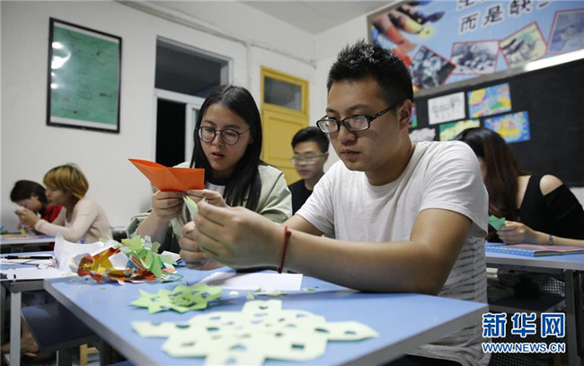 四川省華鎣市慶合初級中學(xué)教師王俊又(右一)與許玉玲在練習剪紙(4月17日攝)。慶合初級中學(xué)位于華鎣山腳下,由于距離縣城較遠,該校大部分教師長期“以校為家”。