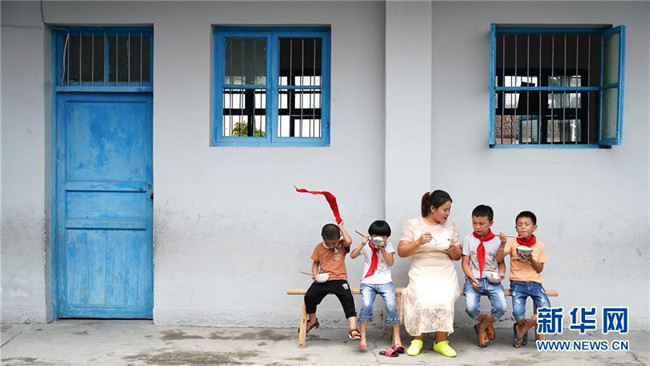 9月4日,江西樂安縣金竹畬族鄉(xiāng)半坪小學(xué)教師陳春英和學(xué)生們坐在教室外吃午飯。2014年,身為“90后”的陳春英和其他幾位從師范院校畢業(yè)的同伴來到深山,開始了特崗教師的生涯。幾年過后,陳春英成為唯一留下來的一位。這幾年,在山區(qū)生活教學(xué)的陳春英遇到了很多新鮮事,也收獲了很多友誼。她說:“看到學(xué)生們健康長大,村民們對我的信賴不斷加深,我覺得這樣的生活也是一種幸福。”新華社記者胡晨歡 攝