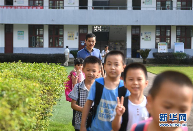 9月6日,福建閩清縣上蓮鄉(xiāng)中心小學(xué)教師張鐘在放學(xué)后送孩子們回家。2006年,“80后”教師張鐘投身鄉(xiāng)村教育事業(yè),主動要求到偏遠教學(xué)點任教。為了能安心工作,他還動員妻子和父母都搬到上蓮鄉(xiāng)工作生活,幫他一起照顧?quán)l(xiāng)村學(xué)校里的孩子們。十多年來,張鐘扎根鄉(xiāng)村,堅守在教書育人的崗位上。新華社記者 林善傳 攝