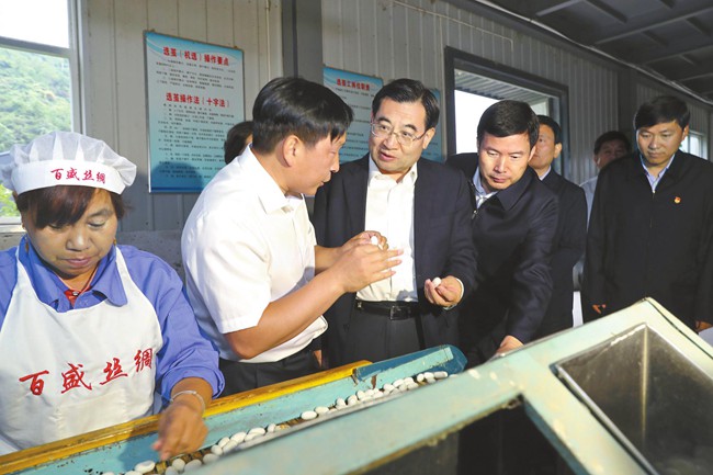 9月13日,省委書記胡和平深入商洛市鎮(zhèn)安縣調(diào)研脫貧攻堅工作。圖為在百盛繅絲廠,胡和平了解選繭、繅絲等生產(chǎn)流程,聽取公司生產(chǎn)經(jīng)營和脫貧幫扶情況介紹。 記者 宋紅梅攝