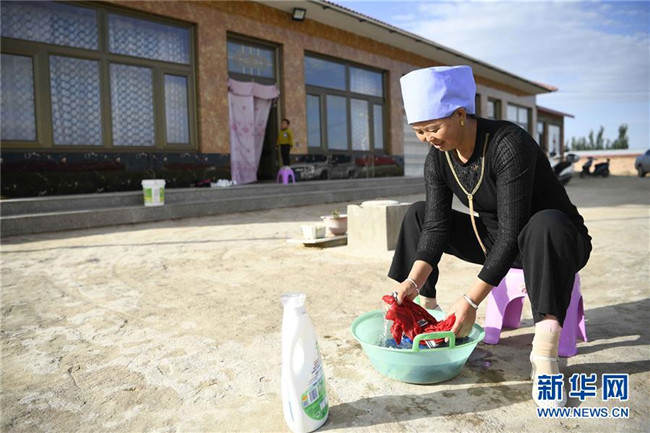 在中寧縣喊叫水鄉(xiāng)賀家口子村,村民金風(fēng)花在洗衣服(9月6日攝)。新華社記者 王鵬 攝