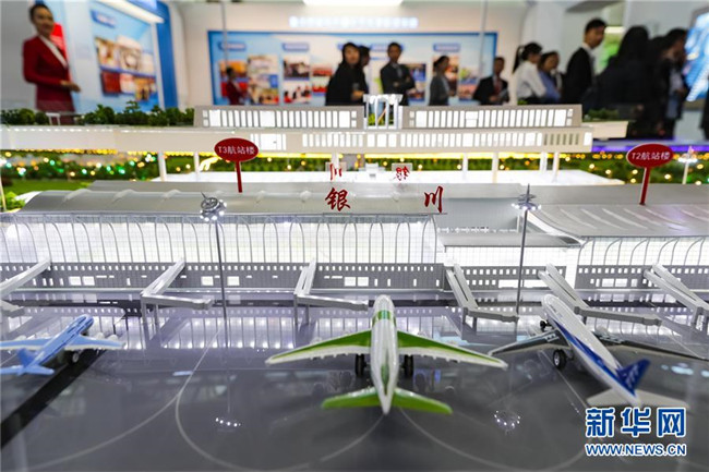 9月19日,觀眾在參觀展覽上展出的銀川河?xùn)|國(guó)際機(jī)場(chǎng)綜合交通樞紐模型。9月19日,寧夏回族自治區(qū)成立60周年大型成就展在銀川國(guó)際會(huì)展中心開(kāi)幕。記者沈伯韓攝