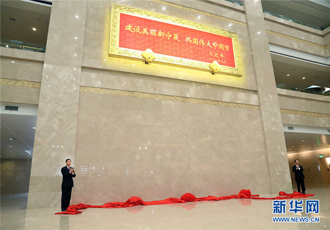 在贈送紀念品儀式上,汪洋和寧夏回族自治區(qū)黨委書記、人大常委會主任石泰峰,一同為習(xí)近平總書記題詞賀匾揭幕。
