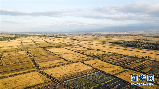 新疆察布查爾錫伯自治縣坎鄉(xiāng)待收割的水稻(9月25日無人機拍攝)。眼下,地處新疆伊犁河谷的察布查爾錫伯自治縣約20萬畝水稻迎來收割季。當?shù)剞r(nóng)民搶抓農(nóng)時,忙碌在金色田園中。記者 胡虎虎 攝