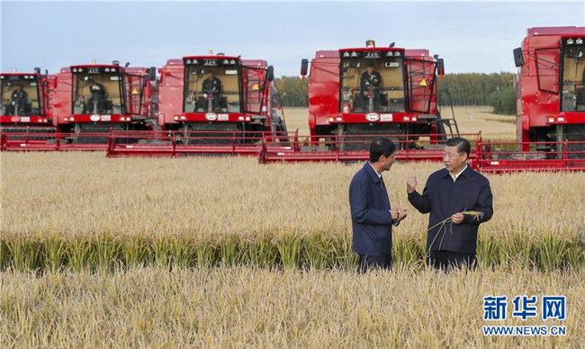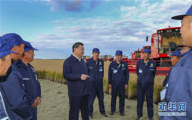 9月25日至28日,中共中央總書記、國家主席、中央軍委主席習(xí)近平在東北三省考察,主持召開深入推進東北振興座談會。這是25日下午,習(xí)近平在黑龍江農(nóng)墾建三江管理局七星農(nóng)場萬畝大地號與農(nóng)場工人們親切交談。 新華社記者 謝環(huán)馳 攝