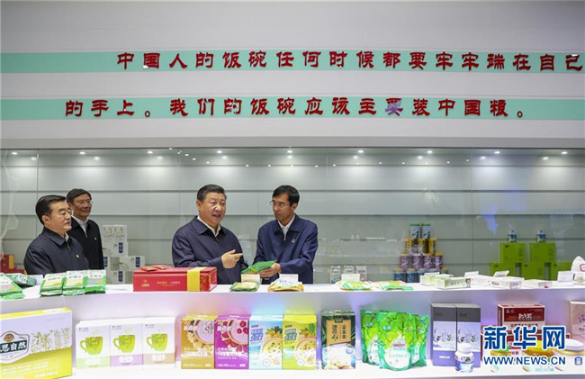 在一樓展示大廳,當?shù)爻霎a(chǎn)的米油豆奶等各類農(nóng)產(chǎn)品琳瑯滿目,習(xí)近平逐一察看,強調(diào)中國人的飯碗任何時候都要牢牢端在自己的手上。他雙手捧起一碗大米,意味深長地說道:“中國糧食!中國飯碗!”