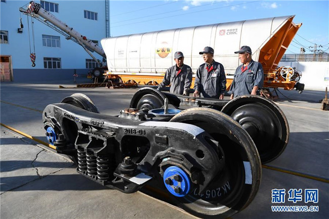中車齊車集團(tuán)有限公司教授級高工李向偉(中)介紹企業(yè)生產(chǎn)的重載技術(shù)領(lǐng)先的中交叉轉(zhuǎn)向架(9月26日攝)。 新華社記者王建威攝