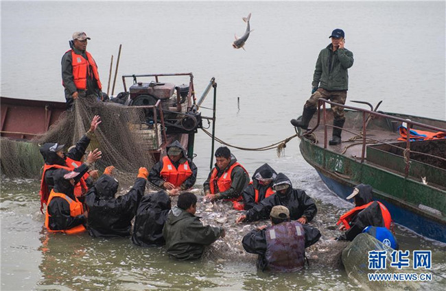 在吉林省松原市查干湖,漁民進(jìn)行捕撈作業(yè)(9月28日攝)。新華社記者許暢攝