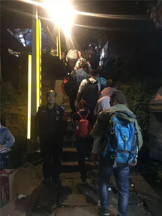 深夜執(zhí)勤人員堅守崗位維護(hù)游覽秩序、主峰區(qū)執(zhí)勤人員勸阻游客遠(yuǎn)離危險地帶,注意夜晚游覽安全