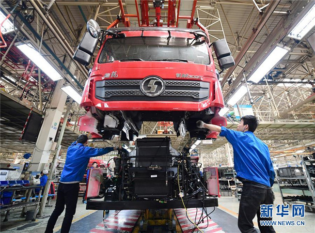 工人在陜重汽汽車(chē)總裝配廠車(chē)間內(nèi)操作駕駛室吊具,將駕駛室與底盤(pán)進(jìn)行連接(3月15日攝)。新華社記者 邵瑞 攝