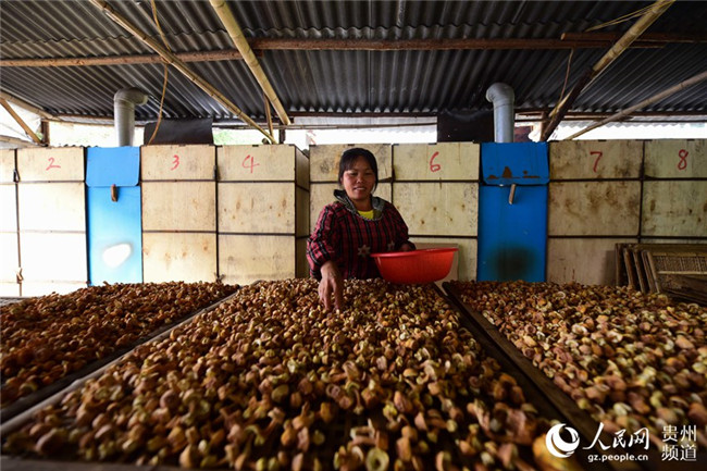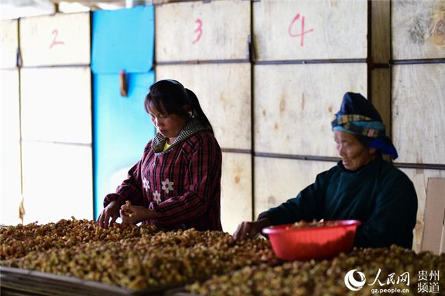 10月10日,村民在貴州省黔東南苗族侗族自治州丹寨縣排調(diào)鎮(zhèn)也改村姬松茸種植基地烘烤房篩選烘干的姬松茸。楊武魁 攝