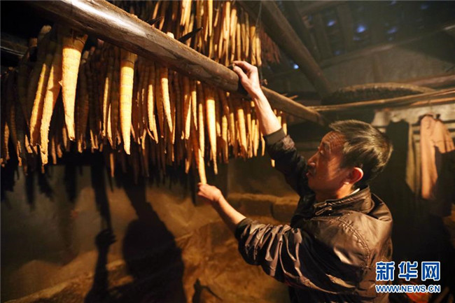 10月14日,在貴州赤水市寶源鄉(xiāng)聯(lián)華村,竹農(nóng)翻看烘烤的竹筍。金秋時(shí)節(jié),貴州省赤水市寶源、兩河口、丙安等鄉(xiāng)鎮(zhèn)種植的5萬余畝大竹筍迎來收獲季。當(dāng)?shù)刂褶r(nóng)加緊采挖竹筍,進(jìn)行加工后外銷。素有“中國(guó)竹子之鄉(xiāng)”的赤水市,現(xiàn)有竹林面積132.8萬畝。竹產(chǎn)業(yè)已經(jīng)成為當(dāng)?shù)孛撠氃鍪盏闹饕乐弧?(王長(zhǎng)育 攝)