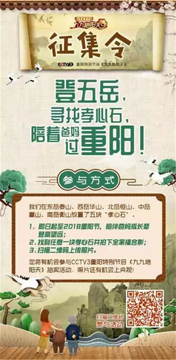 今天是2018年10月17日,農(nóng)歷九月初九重陽節(jié)。由中央廣播電視總臺(tái)央視綜藝頻道(CCTV-3)攜手中華五岳名山,共同舉辦的“登五岳 尋找孝心石 陪著爸媽過重陽”暨“福滿華夏 孝行五岳”最美笑容和祝福征集活動(dòng)正在火熱進(jìn)行當(dāng)中,活動(dòng)至10月17日重陽節(jié)。只要您陪著爸爸媽媽在五岳任意一塊“孝心石”旁拍下全家福合影,并通過掃碼填寫報(bào)名表格,上傳圖片,就可以參加CCTV-3重陽特別節(jié)目《九九艷陽天》的抽獎(jiǎng)活動(dòng),照片還有機(jī)會(huì)上央視哦!