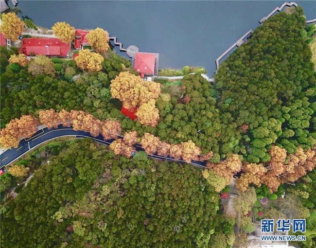 這是如琴湖旁公路的秋色風光(10月20日無人機拍攝)。 新華社記者 胡晨歡 攝