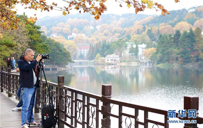 游客在九江市廬山風景區(qū)內(nèi)的如琴湖旁攝影(10月20日攝)。 新華社記者 胡晨歡 攝