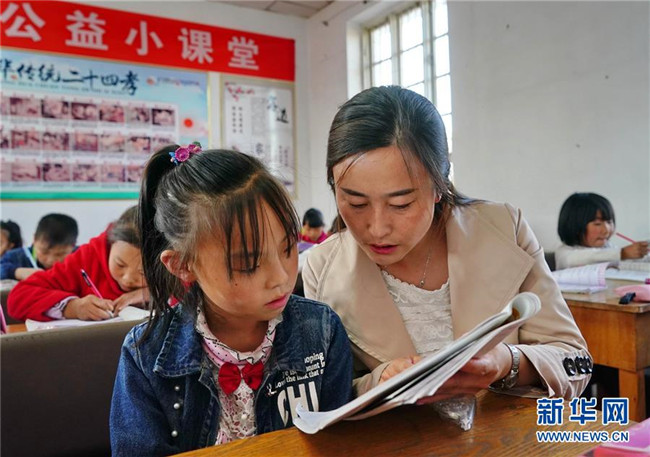 10月23日,李飛燕在提鈴寨村“愛心公益小課堂”為學(xué)生輔導(dǎo)功課。