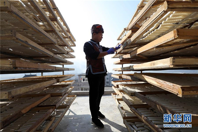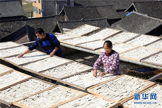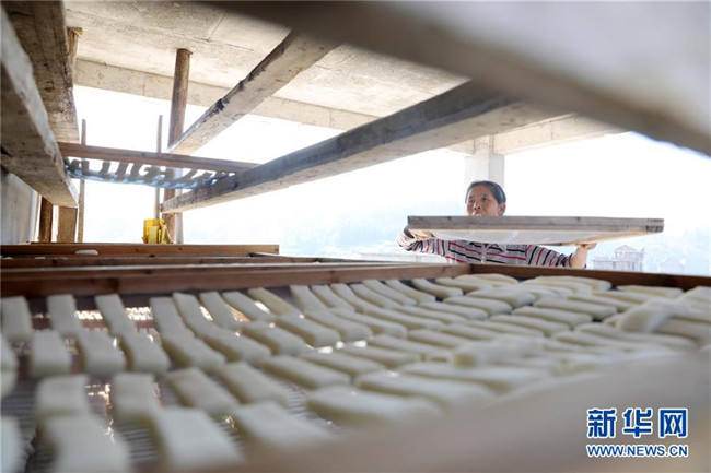 11月4日,在貴州省黎平縣中潮鎮(zhèn)佳所侗寨,村民在晾曬“侗果”粑塊。 近日,貴州省黔東南苗族侗族自治州黎平縣中潮鎮(zhèn)佳所侗寨的村民們搶抓晴好天氣,忙著制作、晾曬“侗果”,侗寨里一派忙碌。“侗果”是當(dāng)?shù)囟弊逋捅貍涞奶厣朗?,是將蒸熟的糯米切成小粑塊后,再經(jīng)曬干、油炸、澆紅糖和上芝麻等工序制作而成。 新華社發(fā)(楊代富 攝