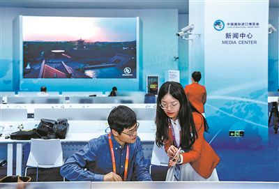 11月4日,首屆中國國際進(jìn)口博覽會進(jìn)入1天倒計(jì)時。來自復(fù)旦大學(xué)、上海交通大學(xué)等34所上海高校的5200多名大學(xué)生志愿者,成為進(jìn)博會志愿者隊(duì)伍的主力軍。圖為進(jìn)博會新聞中心的東華大學(xué)志愿者(右)在為記者解答問題。 張勁松 攝