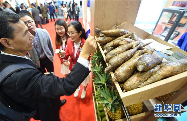 11月6日,參會者在首屆中國國際進(jìn)口博覽會多米尼加展區(qū)觀看展出的農(nóng)產(chǎn)品。新華社記者韓瑜慶攝