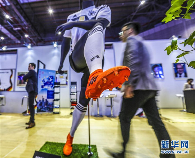 11月6日,參觀者從首屆中國國際進(jìn)口博覽會德國展區(qū)的德國足球國家隊2018年球衣展品旁走過。新華社記者殷剛攝
