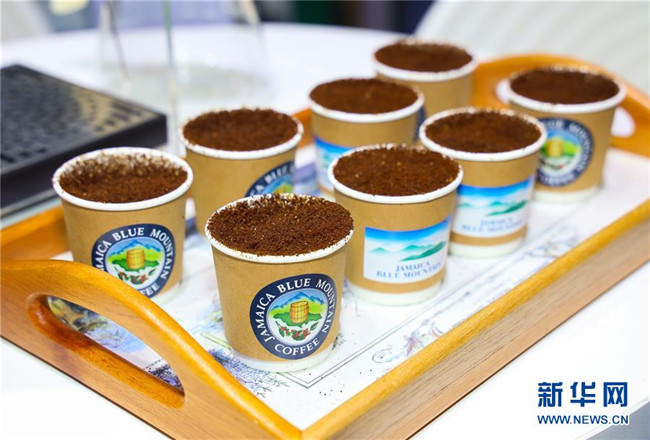 這是首屆中國國際進(jìn)口博覽會加勒比地區(qū)國家展區(qū)牙買加展臺展出的藍(lán)山咖啡(11月6日攝)。新華社記者劉大偉攝