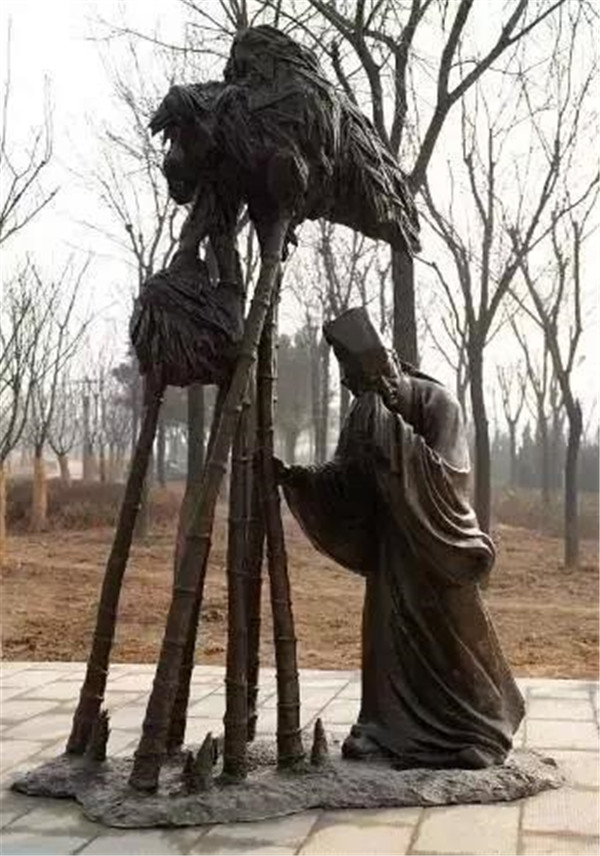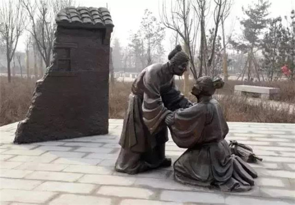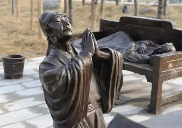 丁蘭,相傳為東漢時期河內(nèi)人,幼年時父母雙亡,他經(jīng)常思念父母的養(yǎng)育之恩,于是用木頭刻成雙親的雕像,事之如生,凡事均和木像商議,每日三餐敬過雙親后自己方才食用,出門前一定稟告,回家后一定面見,從不懈怠。久之,其妻對木像便不太恭敬了,竟好奇地用針刺木像的手指,而木像的手指居然有血流出。丁蘭回家見木像眼中垂淚,問知實(shí)情,遂將妻子休棄。