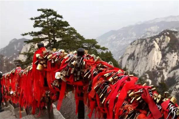 金鎖關(guān)北接五云峰,南控華山主峰,東西兩側(cè)壑深千丈,關(guān)前僅有一米完的臺(tái)階石徑。環(huán)周古松蒼翠,奇石林立,常有祥云環(huán)繞,風(fēng)光非常迤麗。“但有女兒初長成,便為三秦姣姣容。”說的就是奇險(xiǎn)天下第一山的華山除了以其奇、險(xiǎn)、秀而聞名遐邇之外,還別有一番令人動(dòng)容的金鎖關(guān)風(fēng)景:關(guān)內(nèi)、關(guān)外登山路兩側(cè)的鐵索上,情侶鎖、平安鎖,重重疊疊,紅繩彩線迎風(fēng)搖曳,筑成一道美麗的愛情風(fēng)景線,鎖住對(duì)愛情的誓言,表達(dá)堅(jiān)如磐石的愛情忠貞!