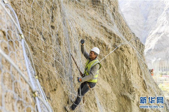 11月12日,在新疆塔什庫(kù)爾干塔吉克自治縣大同鄉(xiāng)鄉(xiāng)政府附近的一處路段,來(lái)自四川的吳飛在峭壁上安裝防護(hù)網(wǎng)。 近日,一支由四川、云南等地工人組成的施工隊(duì)忙碌在帕米爾高原深處的大山中,為塔什庫(kù)爾干塔吉克自治縣縣城至大同鄉(xiāng)道路的易落石路段安裝防護(hù)網(wǎng)。崇山峻嶺間,工人要攀爬至峭壁上施工作業(yè),如躍動(dòng)在大山間的“舞者”。據(jù)介紹,這支施工隊(duì)常年活躍在新疆山區(qū)道路的施工現(xiàn)場(chǎng),為風(fēng)險(xiǎn)路段加裝安全防護(hù)裝置,保障過(guò)往車輛和沿途村民出行安全。 新華社記者 胡虎虎 攝