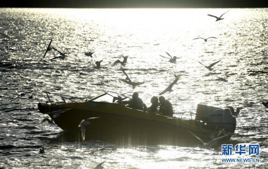11月14日,人們?cè)诶ッ鞯岢厣铣俗未c紅嘴鷗嬉戲?! ⌒氯A社記者 藺以光 攝