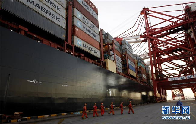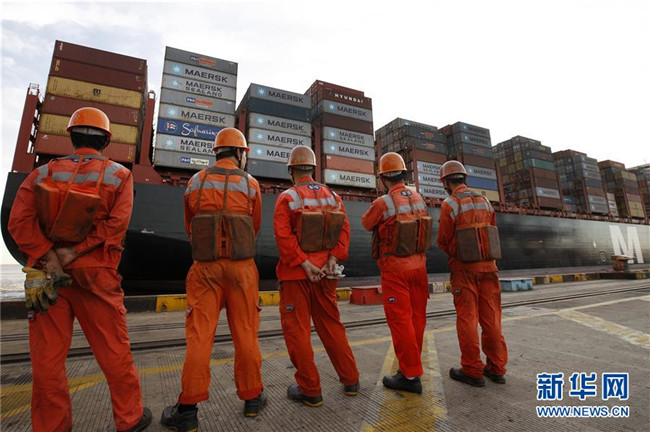 工人列隊(duì)走過一艘停泊在洋山深水港碼頭的集裝箱船(2017年9月13日攝)。新華社記者方喆攝