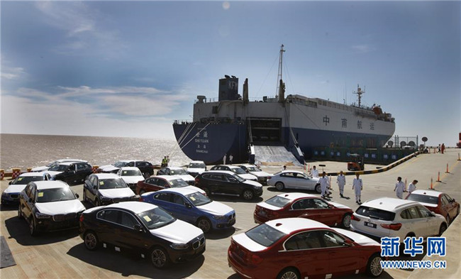 在位于上海臨港新城的自貿(mào)區(qū)滾裝碼頭上,工作人員將卸下船的車輛開到碼頭指定停車場(chǎng)(2017年9月13日攝)。新華社記者方喆攝