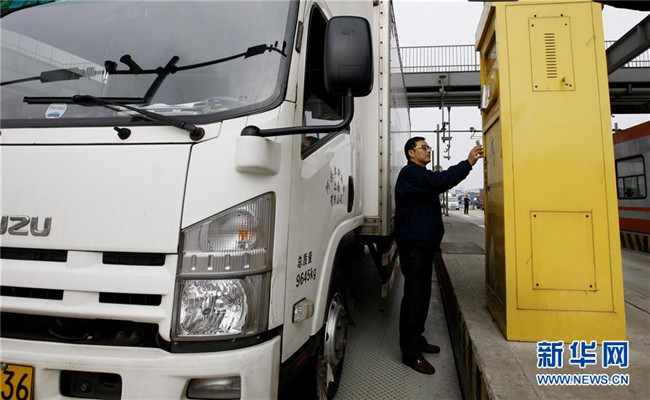 一名卡車司機(jī)在上海外高橋的自貿(mào)區(qū)車輛出入口掃描手機(jī)二維碼完成通關(guān)手續(xù)(2017年1月10日攝)。新華社記者方喆攝