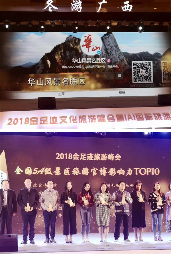 金足跡文化旅游峰會是由新浪網(wǎng)、微博打造的全國性旅游峰會,是旅游行業(yè)的年度大會。本次峰會上發(fā)布了《2018全國旅游數(shù)據(jù)報告》,公布全國省級旅游官博影響力TOP10、全國市級旅游官博影響TOP10、全國5A級景區(qū)官博影響力TOP10及新媒體創(chuàng)新獎名單,華山風(fēng)景名勝區(qū)榮獲全國5A級景區(qū)官博影響力TOP10。
