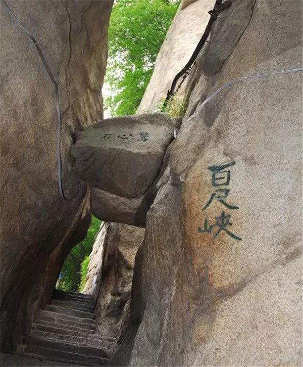 也叫“百丈崖”,過(guò)了千尺幢向北折即可到達(dá),是登華山的第二個(gè)險(xiǎn)境。這里山體峭陡壁立、四方如削,猶如斧子直辟而開(kāi),幾近垂直90度,在旁邊山體覆滿的墨綠植被的映襯下,華山的陽(yáng)剛挺拔之態(tài)盡顯。和千尺幢一樣,百尺峽也是巖隙險(xiǎn)道,有石階91級(jí),游人須挽鐵索而上。