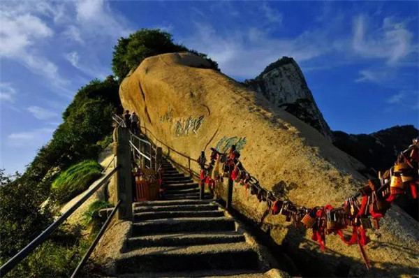 “自古華山一條路”則是經(jīng)典的登山路線,即從玉泉院出發(fā),經(jīng)五里關(guān)——莎蘿坪——毛女洞——青柯坪——回心石——千尺幢——百尺峽——老君犁溝——北峰——擦耳崖——蒼龍嶺——五云峰——金鎖關(guān),到達(dá)金鎖關(guān)后,便可登上中峰,以環(huán)線游覽東、西、南三峰。當(dāng)然,長(zhǎng)空棧道和鷂子翻身也是必不可少的挑戰(zhàn)。
