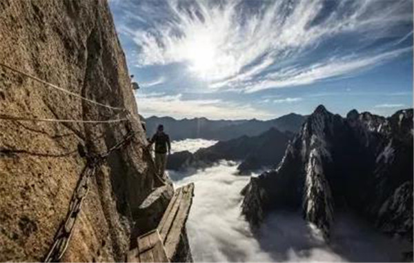 接下來(lái)你將會(huì)挑戰(zhàn)——華山五大險(xiǎn)關(guān)。這五道險(xiǎn)關(guān)分別是千尺幢、百尺峽、老君犁溝、擦耳崖和蒼龍嶺。