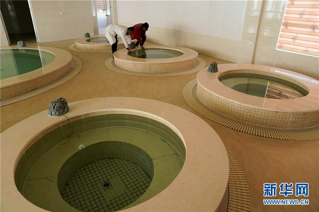 西藏自治區(qū)藏醫(yī)院風濕病防治研究羊八井基地工作人員在查看藥浴池子(2018年11月21日攝)。新華社記者普布扎西攝