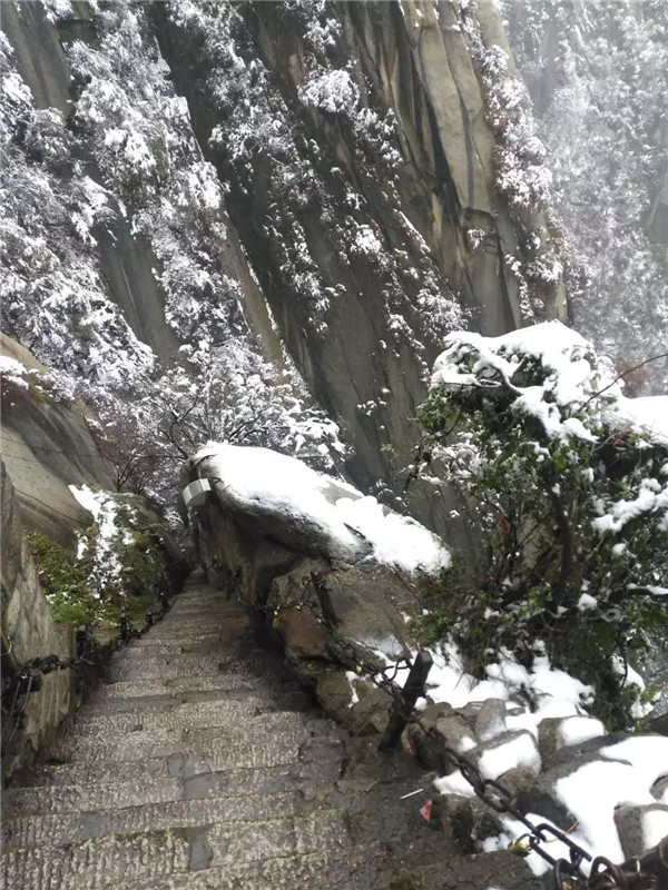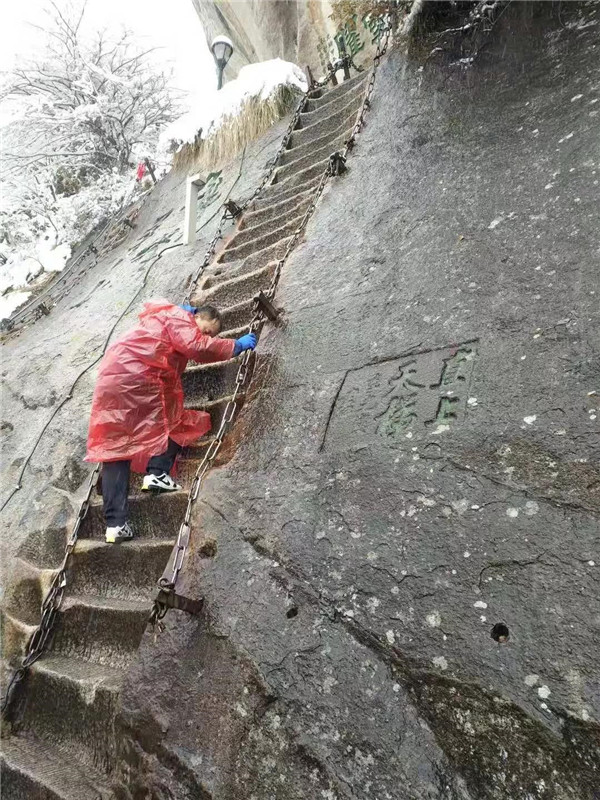 大概到了千尺幢,路就非常陡峭了,幾乎垂直攀登。戴上手套,登山杖收進(jìn)背包,抓緊鐵鏈子,懸崖外寒風(fēng)呼嘯,雨雪交加,絕壁上的古松巍然屹立,驢友相互鼓勵有說有笑,天冷,但心是熱的。