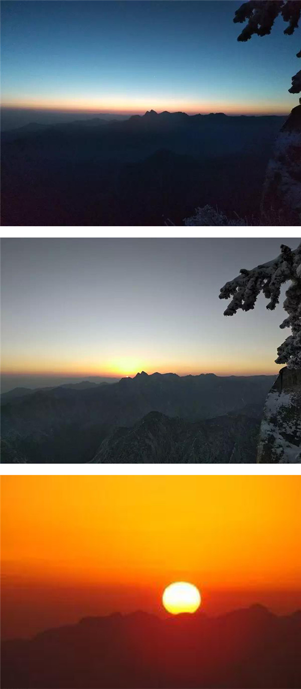 在懸崖上找一個(gè)好位置,等日出。來了不少人,天冷風(fēng)大,但是值得。東方越來越亮,看著近處的白雪,遠(yuǎn)方墨色的群山,突然,灰暗的晨霧下跳出一塊碩大的紅玉,純粹無暇,光芒奪目,這個(gè)世界上任何最好的寶玉都比不了,站在世界之巔,遺世獨(dú)立。