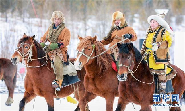 12月26日,馬隊(duì)在“伊薩仁”開(kāi)幕式上表演。 當(dāng)日,內(nèi)蒙古呼倫貝爾市第五屆鄂倫春冰雪“伊薩仁”在鄂倫春自治旗開(kāi)幕。“伊薩仁”是鄂倫春語(yǔ)“集會(huì)”“聚會(huì)”的意思。此次“伊薩仁”期間,將舉行鄂倫春徒步林海穿越、汽車(chē)越野拉力賽、冰雪觀賞、雪上沖浪等活動(dòng),為游客帶來(lái)不一樣的冰雪體驗(yàn)。 新華社發(fā)(丁根厚 攝)