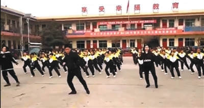 張鵬飛:我們學校其實是個農(nóng)村小學,地方很小,有16個教學班,在校生734人。因為學校很小占地面積不大,也沒有操場,所以不太適合傳統(tǒng)的田徑運動。除了“鬼步舞”,我們還會安排武術(shù)操。
