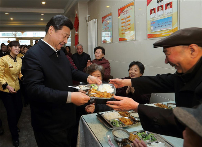 2013年2月4日,習(xí)近平來到蘭州一家“虛擬養(yǎng)老院”的養(yǎng)老餐廳,了解有關(guān)情況,還端起一個(gè)盛滿飯菜的餐盤,走到72歲的老人楊林太面前,輕輕送上,請他用餐。